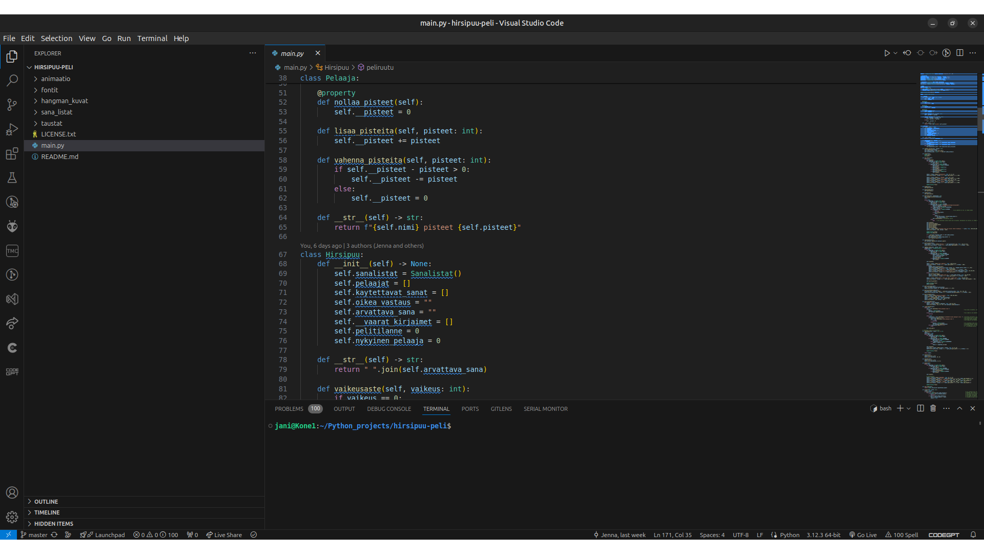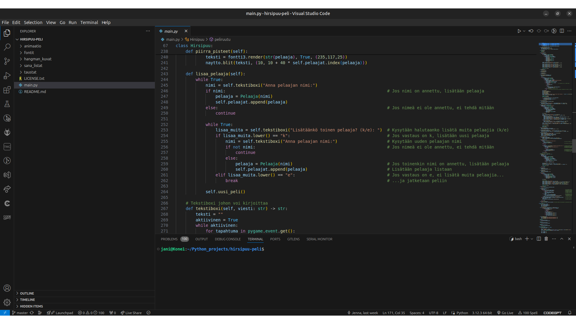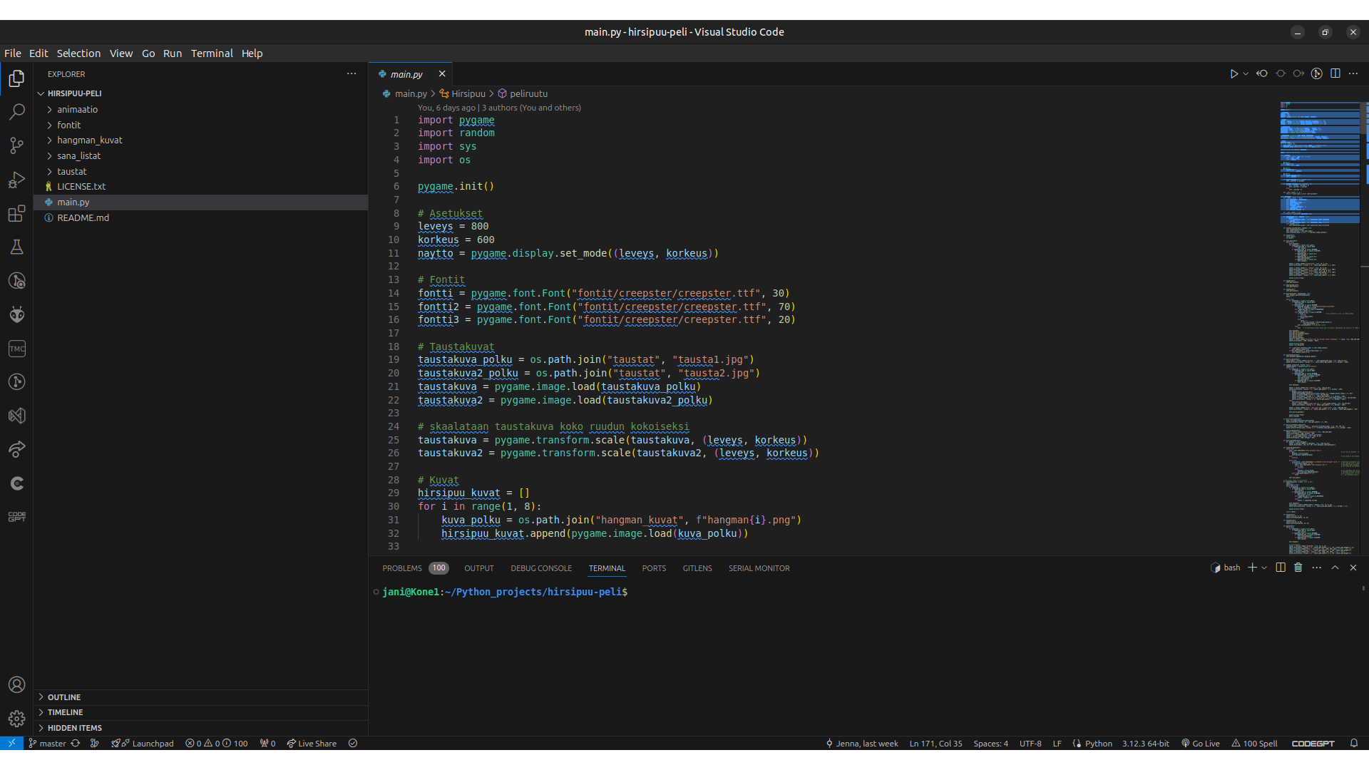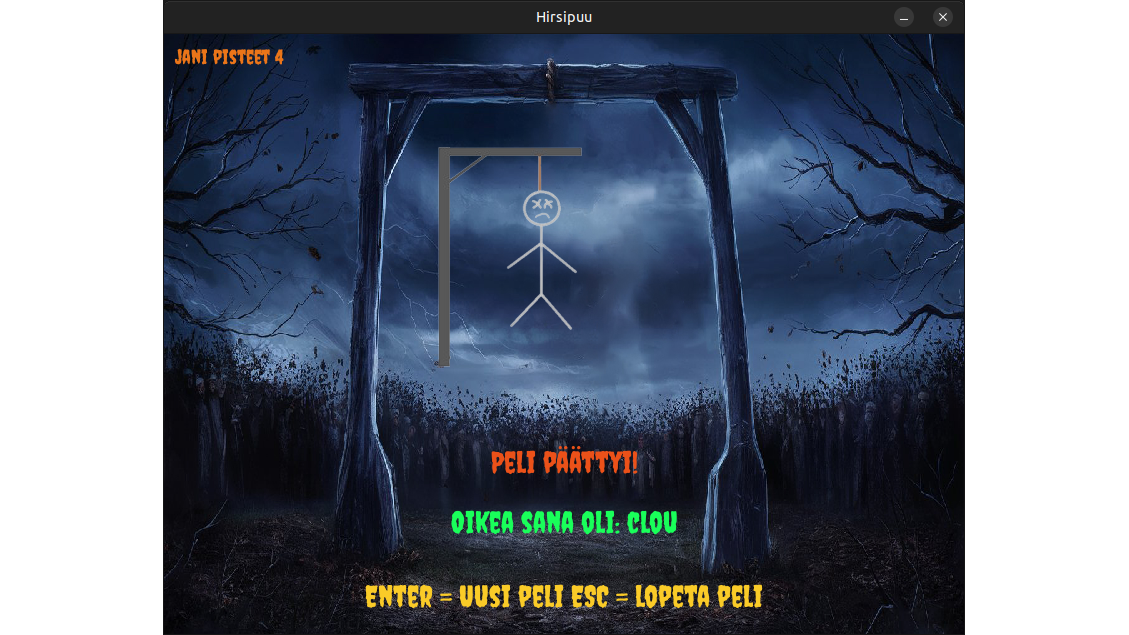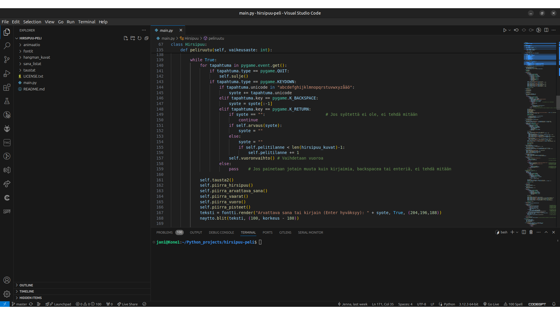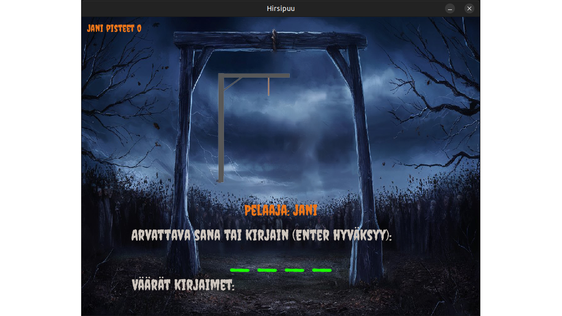Koulun ryhmätyönä toteutettu ja Python kielellä kirjoitettu hirsipuupeli.